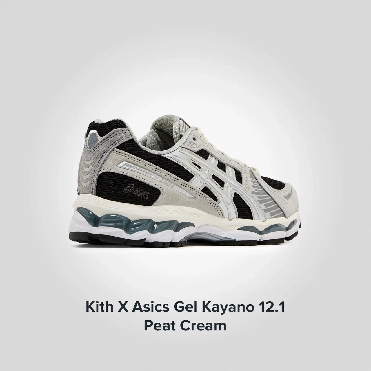 Кроссовки Kith X Gel Kayano 12 1 Peat Cream выполнены из черной сетки с накладками из светло-серой замши и рельефными полосками с серебристо-металлическим принтом тигра. Треугольная эмблема выделяет японское слово «tamodachi» рядом с логотипом Kith. Оба логотипа бренда украшают стельки, отдавая дань уважения партнерству. Промежуточная подошва из пеноматериала во всю длину стопы содержит гелевые амортизирующие вставки GEL в области носка и пятки. Резиновая подошва с гибкими канавками обеспечивает естественный и эффективный шаг.